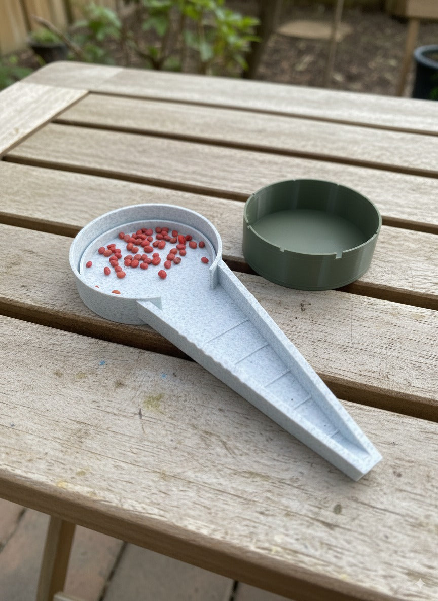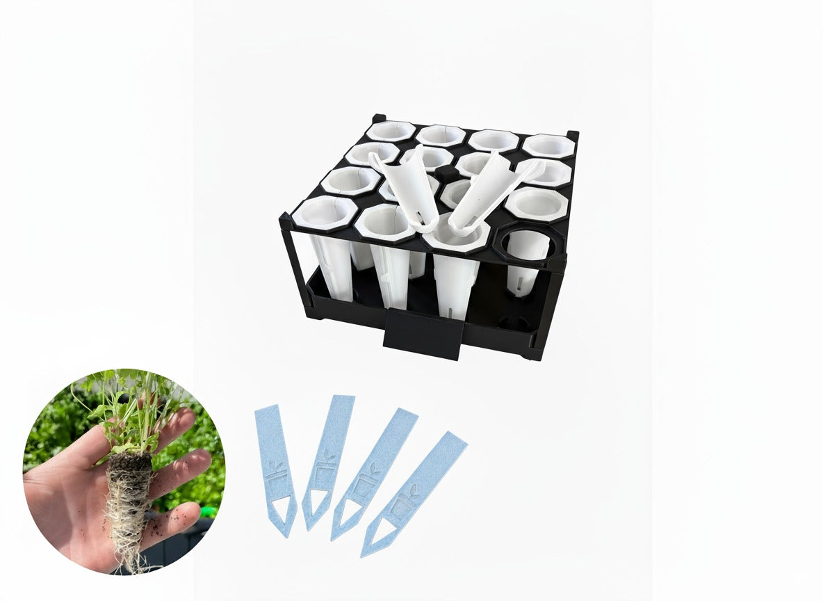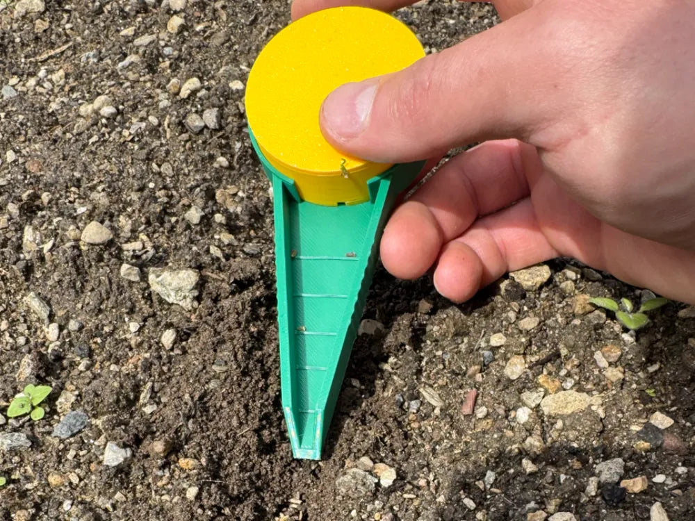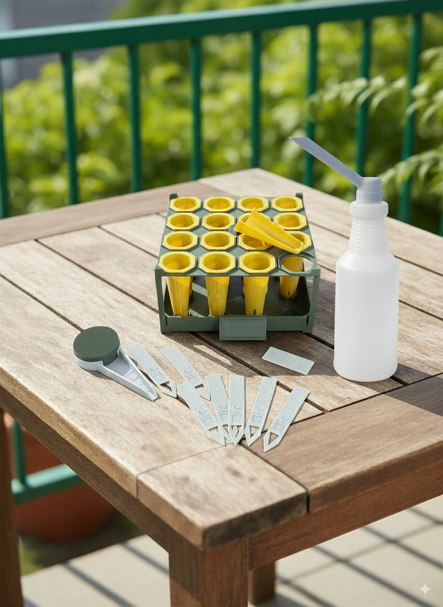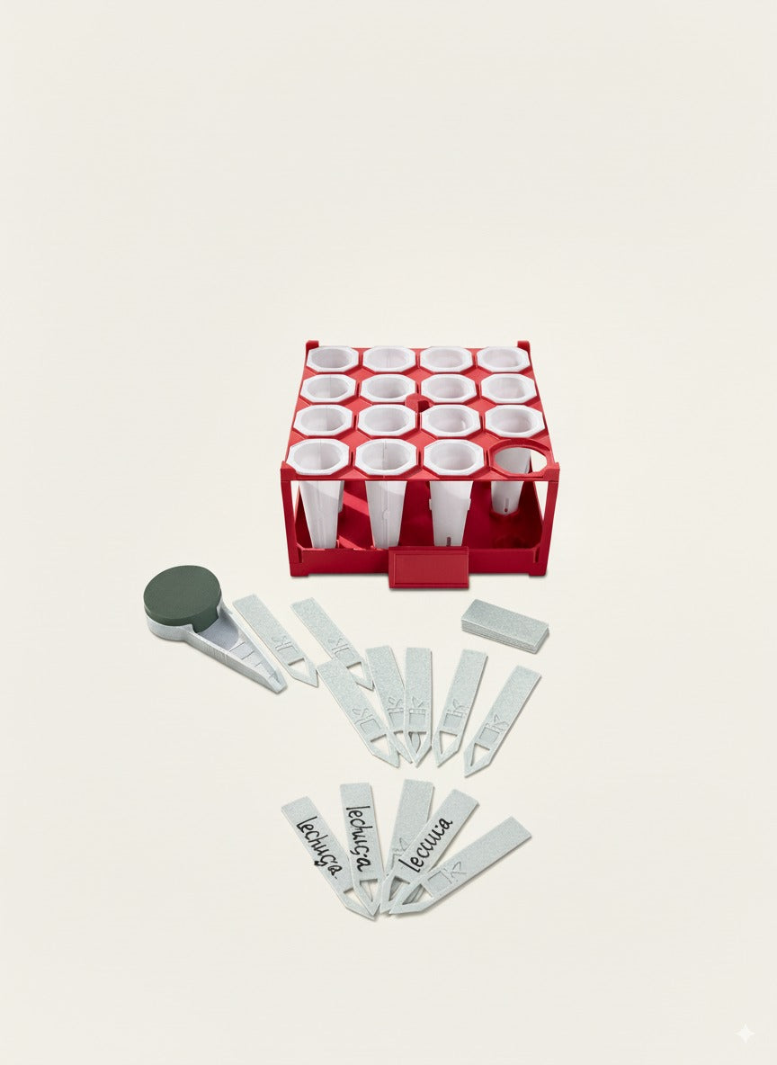 También encontrarás un regador manual compatible con cualquier botella PET, etiquetas reutilizables para identificar fácilmente tus cultivos y un sembrador manual, perfecto para sembrar directo en la tierra con precisión y comodidad.