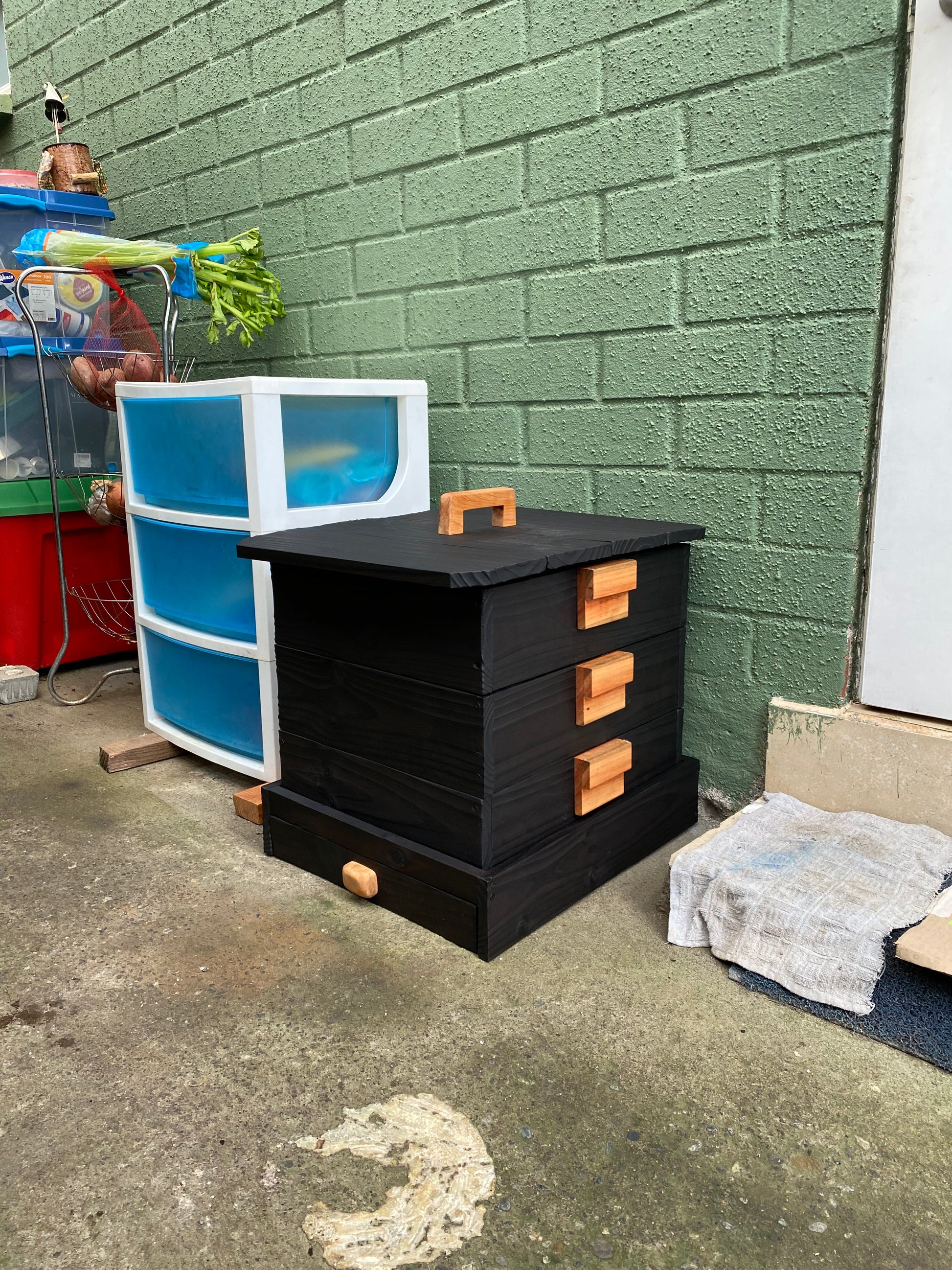 - Tratamiento natural japonés de la madera que le otorga su color oscuro carácteristico y prolonga su vida útil