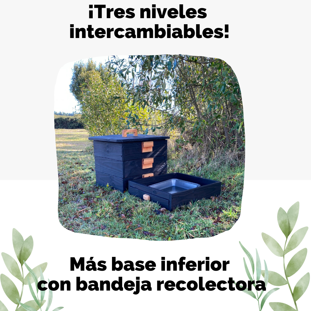 - Tres niveles superponibles y una base con bandeja de lixiviados